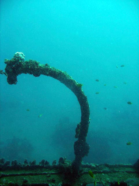 Wrack of steel Dutch merchant ship, sunk in 1942. Diving around Bunaken island, Molas Wreck dive site. Sulawesi,  Indonesia.