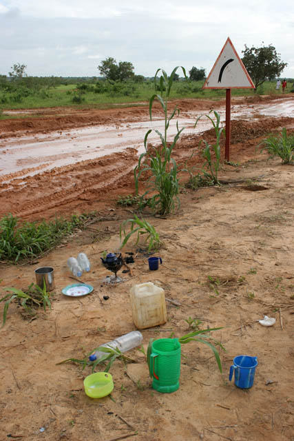 Traffic accidents are relatively common. Small unsealed part of roud from Niamey to Agadez is blocked by crashed truck. Niger.