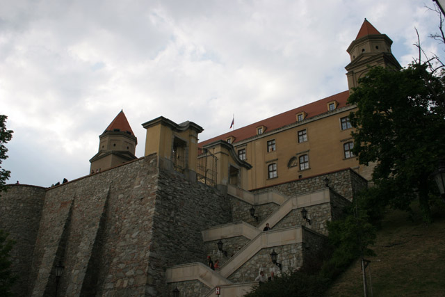 Bratislava Castle from 13th century is massive rectangular building with four corner towers. The Castle is located on the top of the hill of the Little Carpathians directly above the Danube river in the middle of Bratislava. Slovakia.