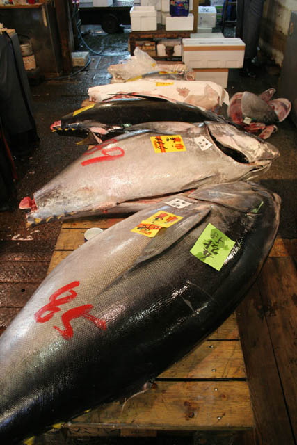Morning tuna auction. Sellers are checking quality of tunas. Tsukiji fish market, Tokyo. Japan.